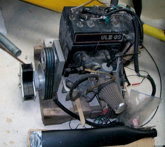 McCornack settled on a two-stroke snowmobile engine produced by the Cuyuna Development Company as having the best potential. In 1979 He modified the engine with a crankcase extension, an additional main bearing, lowered the compression ratio using an additional head gasket and substituted a smaller 32 mm (1.26 in) Mikuni carburettor, amongst other modifications. The original snowmobile engine produced 40 hp (30 kW). Lowering the compression ratio not only de-rated the engine, but also made pull-starting easier and allowed it to run on lower-octane regular auto fuel. The resulting engine worked well, was de-rated to produce 30 hp (22 kW) at 5,500 rpm and proved reliable in service.