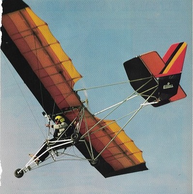 Recognition points include a rectangular plan form wing with triangular wing tips and double skin fabric over the whole chord. It has spoilerons of single thickness cloth and the trailing edge is notched between each batten, giving the impression of a batwing. Options are a braked steerable nosewheel, wheel fairings, reserve petrol tank, floats, skis, a parachute and an instrument panel. A single seat, single engined, high wing mono¬plane with conventional, three axis control. The wing has unswept leading and trailing edges, and constant chord except for triangular wing tips; cruciform tail. Pitch control by elevator on tail; yaw control by fully flying rudder; roll control by half span spoilerons; control inputs through stick for pitch/roll and pedals for yaw. The wing was braced from above by kingpost and cables, from below by cables; wing profile; 90% double surface. Undercarriage has three wheels in tricycle formation; torsion bar sus¬pension. Optional push right go right nose¬wheel steering connected to yaw control. Optional brake on nosewheel. Aluminium ¬tube framework, without pod. Engine mounted above wing driving pusher propeller. Tubing used is 6061T6 anodized aluminium; wing covering is Dacron. Rigging is vinyl ¬coated stainless steel cable. Price (January 1983) $4995 in kit form.