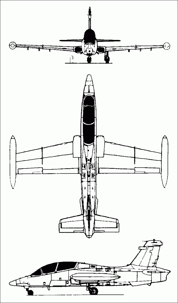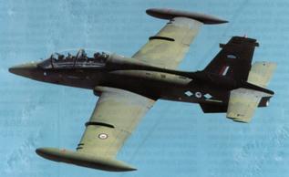 The 1972 designed Viper 632 powered Aermacchi MB339 produced in Varese, Italy, became the successor to the MB-326 and the Fiat G91. Sharing much of the MB-326K airframe structure, the MB-339 has a redesigned forward fuselage to allow the tandem seating to be staggered vertically, for the instructor to see over the pupil, the vertical tail enlarged, raised fin, a revised nose gear, stronger wings, Martin-Baker Mk.10 zero-zero seats, nose wheel steering and modern avionics. Six hardpoints (up to 1815 kg/4,000 lb) al¬low a combined trainer/light strike role. The wing is NACA 64A212 at the root and NACA 64A114 at the tip.