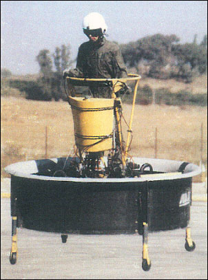 The engines are mounted on four sides of a square gearbox which also serves as pedestal supporting the occupant. Rotors extend from the lower end of gearbox. The engines and propellers are off-the-shelf ultralight components and the circular outer duct is of graphite/epoxy construction.