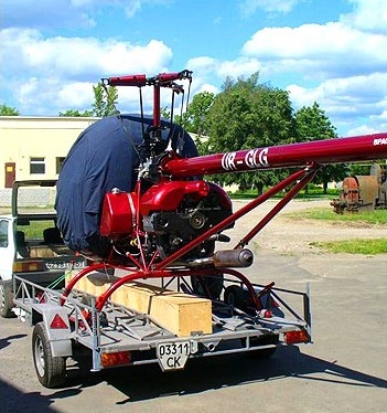 The three rotor blades are made of composite material with non-linear construction. Powered by a Subaru EJ-25, with belt drive reduction, the minimum fuel is 95 octane. The composite floor with its lower triangulated aluminium sub-frame are the main structural elements. The floor is made of a 16mm plywood with machined out pockets filled with foam inserts, with a skin of composites on both sides. The lower Duralumin frame is riveted together CNC machined elements which are atached to the rest of the airframe.