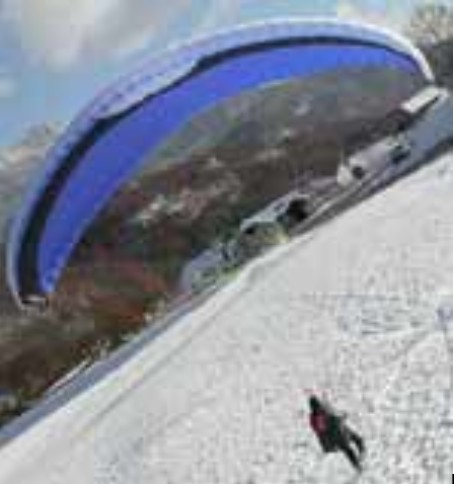 The Yogi gliders range is a school/beginners model, certified Afnor Standard, with 35 cells and aspect ratio of 4,6. Compared to FP’s Astair, it has a more progressive launching behaviour, “a bit less physical”, according to Aerodyne, and also with a better turn: “the glider rolls easier with the brake, but the stability is better”. It is available in 4 sizes, from XS to L.