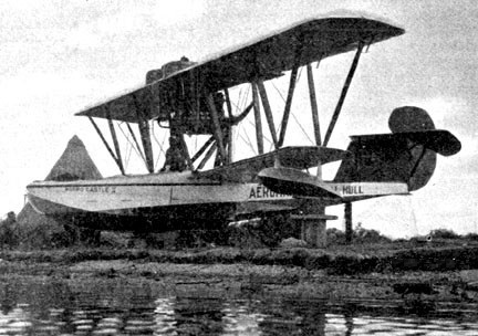 Long before Photoshop, this bit of “creative enhancing” asks more than it tells. It could be a short-wing version of AMC, dubbed Morro Castle II, but its placement in an Egyptian setting is a mystery—perhaps for an ad with a relevant headline. The plane appears to be pasted on the background—a small seam below the rudder hinge is visible. If it is supposed to be landing, it is doomed. The prop is stopped and the pilot sits on the coaming away from the controls, which are set for a severe left hand dive into the Nile.
