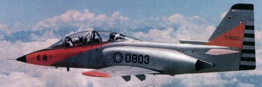 With development and design by AIDC begun in 1975, with assistance from Northrop, the first XAT-3 prototype flew on September 16, 1980. The aircraft is a twin-turbofan tandem-seat trainer with an unswept wing of supercritical section. Power is from two Garrett TFE731 engines, each giving 15.57kN thrust. For weapons training and light attack duties a semi-recessed gun pack with twin 0.5in machine-guns can be installed in a weapons bay beneath the rear cockpit, and external stores can be carried on four under-wing and one under fuselage hardpoints. Wingtip launch rails for AIM-9J Sidewinders are provided. Total external weapons avaiable load is 2,720kg (6,000lb). An A/A37U-15TTS aerial target system can be carried on the centreline pylon.