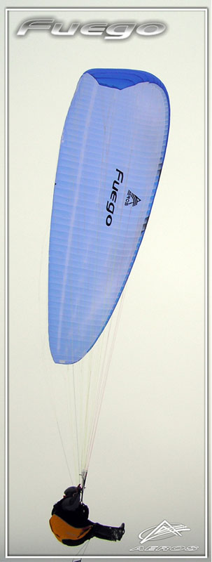 Aeros Fuego was a cross country paraglider built in 2007 as a compromise between reasonable safety and high flying characteristics, class EN “C”, and available in 27 and 29 sizes, to replace the Aeros Select – the previous wing for thermal flying.