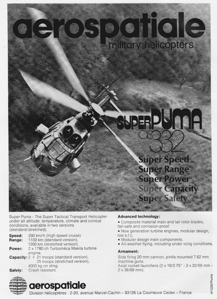 Sud-Aviation SA330 Puma / SA331 / SA332 Gallery 19/12/202322/09/2025Terry Back to Sud-Aviation SA330 Puma / SA331 / SA332 Puma HC-1 of 230 Sqn at Gütersloh, 1982 A Puma fitted with an Orchidée battlefield surveillance radar IAR-330L Romanian Navy IAR 330 Puma April 1983 Share this: Click to share on X (Opens in new window) X Click to share on Facebook (Opens in new window) Facebook Like Loading... Related