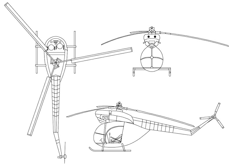 Enclosed cabin seating two side-by-side with dual controls. Entrance door on each side of cabin. Landing gear is skid type. Track of skids 2.0m