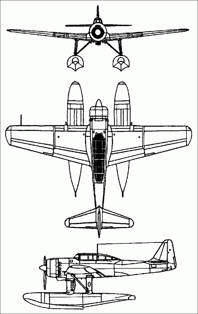 The E16A (“Auspicious Cloud”) floatplane was devised as a direct successor to the E13A “Jake” series. The E16A has crew accommodations for a pilot and a rear-cockpit gunner. Pontoons were fitted underside in place of traditional landing gears. Standard armament was 2 x 20mm forward-fixed cannons in the wings and a single 7.7mm machine gun for the rear gunner. An under fuselage position was utilized for strike runs, though the primary use of the aircraft was of carrier-based reconnaissance.
