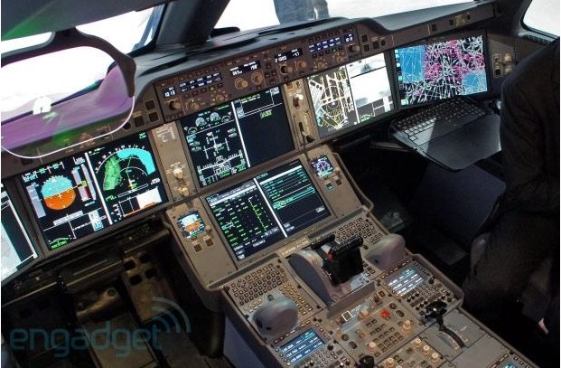 The cockpit adopted 38 cm (15 in) LCD screens. The six-screen configuration having two central displays mounted one above the other (the lower one above the thrust levers) and a single (for each pilot) primary flight/navigation display, with an adjacent on-board information system screen. The A350 XWB also features a head-up display.
