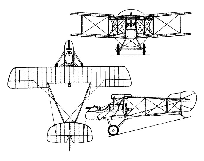 A conventional two ¬bay biplane of pusher configuration, the fuselage was curved along the front and top surfaces with slab sides and a flat underside – and held the armament, pilot, controls, fuel and engine. The pilot sat in an open-air cockpit “tub”. A single machine gun was fitted to the front of the fuselage. Fuel was held directly aft of the pilot in one tank, and ahead of the engine, the latter mounted to the extreme end of the fuselage rear with a two-blade wooden propeller. Wings were in a two-bay with parallel struts additionally held by cabling. Both upper and lower wings sported slight dihedral. The empennage tapered off to become a single vertical tail fin with a high-mounted horizontal plane affixed. The undercarriage was fixed in place and featured two large main landing gear wheels attached to the fuselage underside. The rear of the aircraft was supported by a simple tail skid.