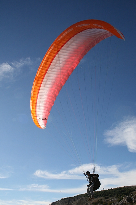 Not based on a low-performance parachute profile, but on the biconvex profile of a gentle LTF 1-2 glider it is easy to handle even in strong winds of 40 km/h. The speed glider with its simple line and riser concept is available in 15 sqm Projected Area.