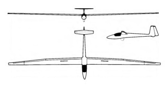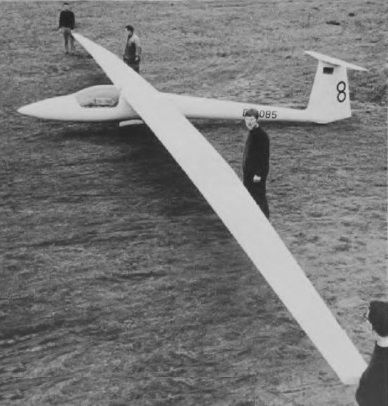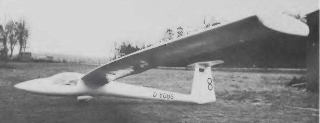 But some problems were encountered with the wing geometry, especially aileron length, load distribution over the wing and rudder action, and as a result the maximum speed had to be limited to only 107mph. Later, wing span was reduced to 21m (68ft 11 in), this giving an improvement of 12mph in the maximum speed. The SB-9’s wing is of PVC foam construction for lightness, and has a glassfibre roving spar; the HKS type flaps are of elastic glassfibre construction with no hinge or gap.