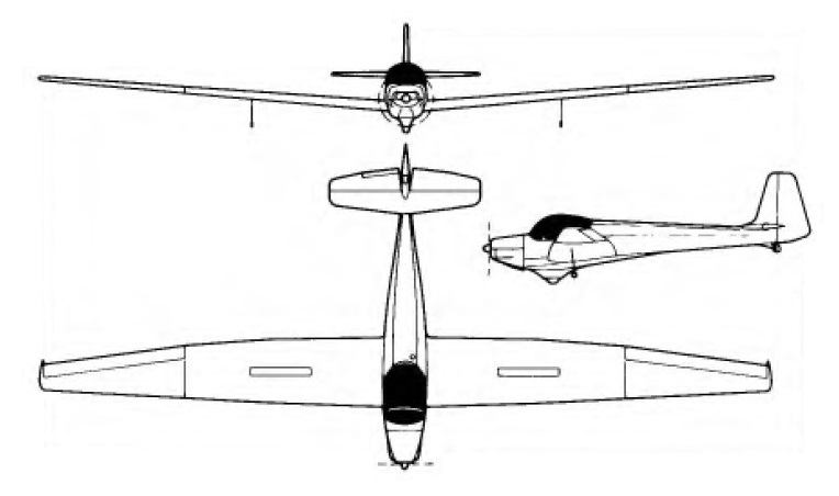 The cantilever low wings are of conventional wood and fabric construction with spoilers in the upper surfaces, and can be folded back to an overall width of 32ft 9.5 in (10m) for hangar storage. The fuselage is a fabric covered steel tube framework and the rear section of the two-piece cockpit canopy slides backwards for the pilots’ access; the latter have dual controls. The cantilever tail unit has a low-set tailplane with a trim tab in the starboard elevator. The undercarriage consists of a non-retractable monowheel recessed into a fairing under the fuselage, and small outrigger wheels on nylon legs under the wings at about 40% of each half-span; there is also a steerable tailwheel, and the main wheel brake can also be used as a parking brake.
