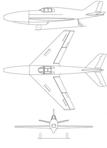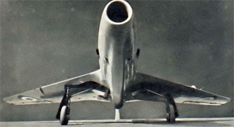 Early studies for the new project, named Turbofreccia, instaled two Turbomeca Palas, positioned in the fuselage just behind the pilot’s seat, with air intakes n the wing roots. This arrangement was finally abandoned by Stefanutti who preferred the new Marboré II of 380 kg thrust. The engine is located in the front part of the fuselage, with a nose air inlet. The exhaust nozzle opens behind the trailing edge of the wing.