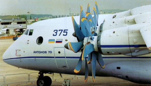 The development of the An-70 program began in 1975 but the collapse of the Soviet Union effectively stopped the funding of most major new programs. The An-70 has the high wing and tail loading ramp for a tactical freight aircraft and uses contra-rotating propfans. Each propfan has contra-rotating propellers; the front has eight composite blades, the rear just six.