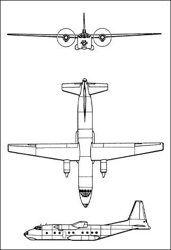 The An-8 military and civil transport aircraft was designed for the Soviet Air Force and Aeroflot. Both aircraft carried the NATO reporting name Camp. First flown in February 1955, the prototype military An-8 was exhibited at Tushino in 1956, powered by two 3,800kW Kuznetsov turboprop engines and with a cannon in a tail turret. 151 were built in several versions.