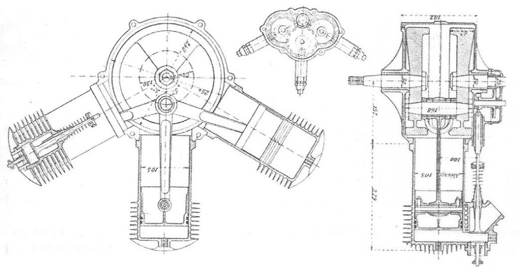 In response to the growing interest in aviation in France after the Wright brothers’ visit in 1908, Anzani produced the first of a series of three-cylinder fan flight engines. The cylinders were each a single iron casting and the one-piece crankcase was aluminium. Pistons were steel with cast rings. In most of these the outer cylinders were at 60° to the central one, though a contemporary diagram shows one, described as the cross channel engine, with a 55° angle. They were all air-cooled side-valve engines; each exhaust valve was controlled from below by a cam in the crankcase. Each was mounted in a cell to the side of the cylinder, with the automatic, atmospheric pressure -driven spring-loaded inlet valve immediately above it, partly to minimise volume and partly to help cool the hot exhaust valve. Most contemporary and pre-1921 sources agree that the bores of these early engines were between 100 and 105 mm (3.93 and 4.13 in), but strokes between 120 and 150 mm (4.72 and 5.90 in) are quoted. Most put the output of these engines at about 18 kW (24 hp) at around 1,400–1,600 rpm.