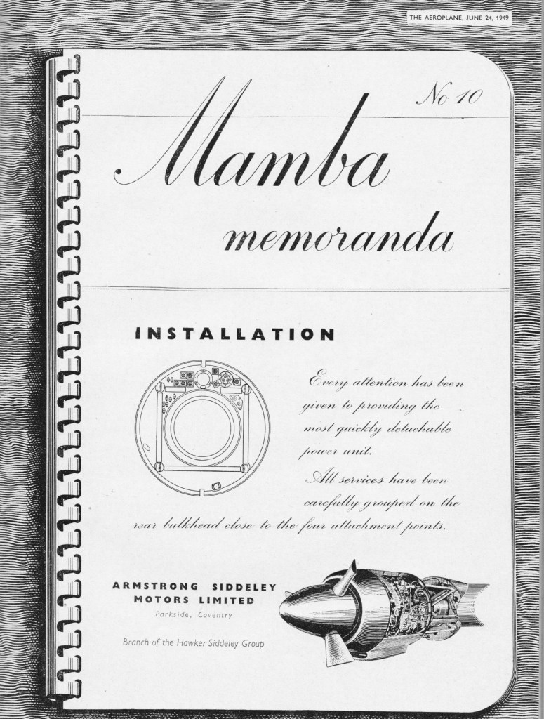 The Mamba was a compact engine with a 10-stage axial compressor, six combustion chambers and a two-stage power turbine. The epicyclic reduction gearbox was incorporated in the propeller spinner. Engine starting was by cartridge. The Ministry of Supply designation was ASM (Armstrong Siddeley Mamba). First run in April 1946, the ASM.3 gave 1,475 ehp and the ASM.6 was rated at 1,770 ehp. A 500-hour test was undertaken in 1948 and the Mamba was the first turboprop engine to power the Douglas DC-3, when in 1949, a Dakota testbed was converted to take two Mambas.