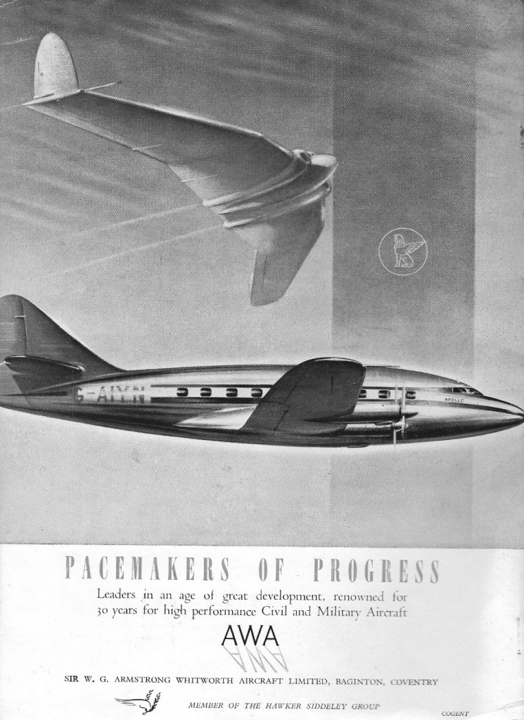 Notable airliners were the three-engined Argosy biplane (1926), four-engined Atalanta monoplane (1932), and the much larger Ensign (1938). The company’s most famous product was the Whitley twin-engined bomber of 1936, in which year Hawker Siddeley Group was formed, with Armstrong Whitworth as a member company. In July 1943 the 1,824th Whitley left the assembly line at Baginton, Coventry, the type having achieved several historic “firsts” in RAF service. The Albemarle (600 built) was used as glider-tug and transport, and Avro Lancaster bombers were built in dispersed factories. After the war, from the basic Gloster design, the company developed and produced in quantity Meteor two-seat nightfighters. When this type was well advanced they undertook development of the Hawker Sea Hawk naval fighter. Avro Lincolns, Hawker Hunters, and Gloster Javelins also produced. Experiments made with flying-wing aircraft and prone-pilot position were undertaken. The Apollo turboprop airliner (1949) had no commercial success, though the Argosy twin-boom four-turboprop freighter (1959) gained limited civil and military orders.