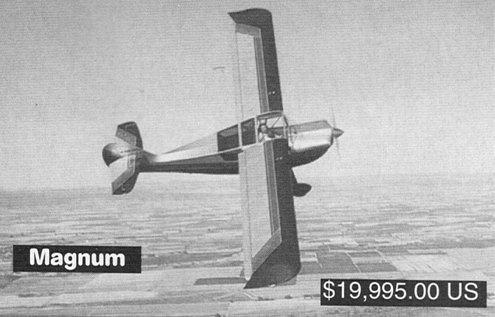 Designed by Dean Wilson, the Magnum will take off the ground in less than 150 feet and will climb 1800 fpm solo. It features a 44.5 in wide cabin (ches) and an open baggage area of 28.5 cubic feet. There is an optional jump seat for a small adult or a couple of kids. The Magnum was available in the Tri or tail-gear landing gear configuration.