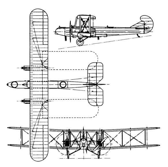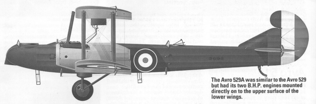 While the Admiralty had not placed an order for the Avro 523 Pike there was some interest in the Potential of the aircraft. During 1916, two prototypes were ordered for evaluation in a long-range bombing role and were in effect slightly larger version of the 523. Apart from dimensional changes, the wings were made to fold, from jus outboard of the engines, the tail unit was revised, and the powerplant of the first completed, as Avro 529, comprised two counter-rotating Rolls-Royce Falcon engines, mounted between the wings and driving tractor propellers. The second prototype, the Avro 529A, was similar except for the installation of two 230 hp / 172 kW Galloway-built B.H.P. inline engines mounted on the lower wing, and a revised fuel system. Forward-looking features of the design provided the front gunner / bomb aimer with dual controls, plus Gosport tube communication with the pilot so that he could guide him during a bombing attack. However, performance was not good enough, and only the two prototypes were built.