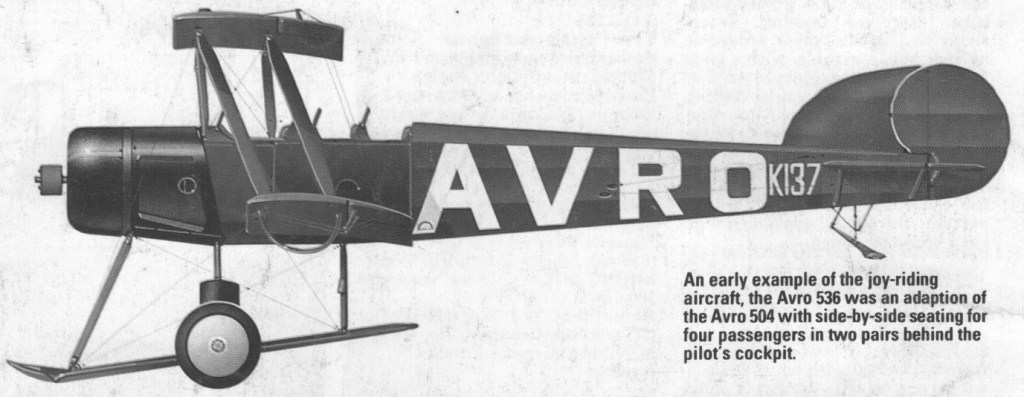 Early post-war pleasure flying was booming and a batch of Avro 504Ks were modified at the company’s Hamble factory. The fuselage was widened 9 in / 22.8 cm to accommodate four passengers in two pairs in the rear cockpit. The first conversion flew at Hamble in April 1919 and was later fitted with floats, the only such floatplane.