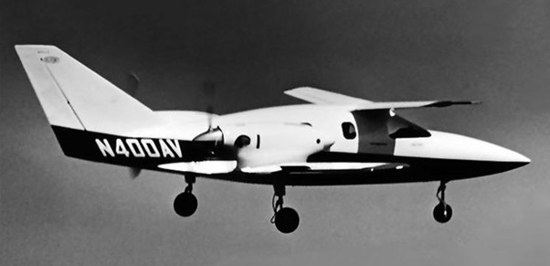 It featured over the wing pusher propellers, high mounted forward canard, bizarre wing shapes, all-Kevlar construction and lack of elevators.