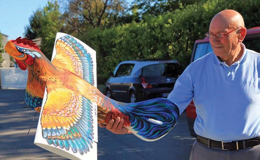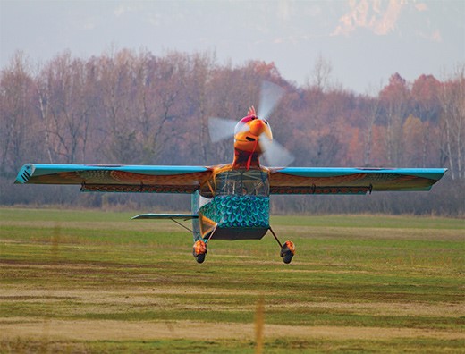 The Rooster took about three years to conceive, design and build. Ottone started with model airplanes, first a “chuck” (hand-launched) glider and then a radio-controlled version. Proving that in small scale such a design would fly, he developed a prototype that would be partially like a conventional, three-axis-controlled small airplane, but would have the world’s most exotic color scheme—plus the head of a rooster.