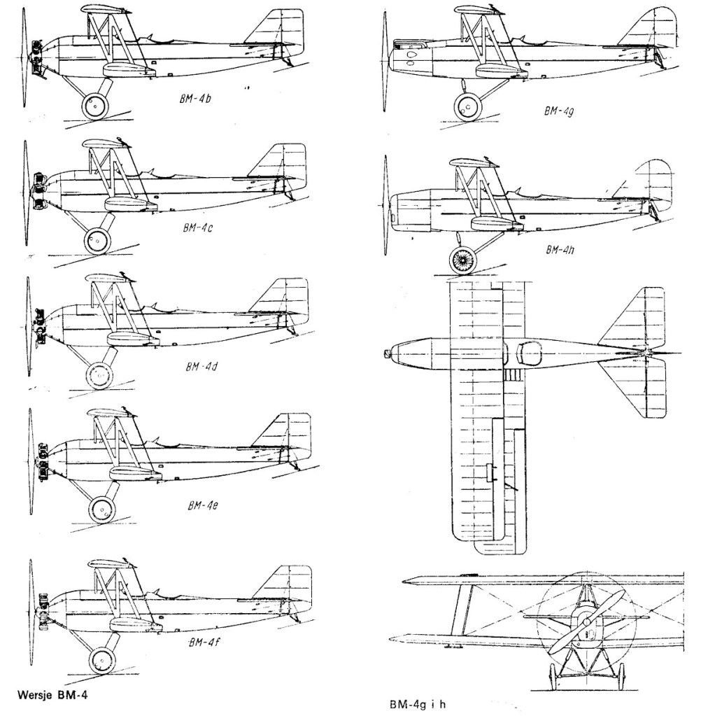 Next several variants remained experimental. The BM-4c with a 125 hp Lorraine-Dietrich 5Pb radial engine, built as a one-off in 1928, was supposed to be used for long-distance flights to advertise the engines, but was finally used as the factory’s aircraft. Three BM-4a’s were converted to BM-4e of 1930 with the Polish experimental 85 hp Peterlot radial engine, the BM-4f of 1931 with the Polish experimental 120 hp Skoda G-594 Czarny Piotruś radial engine, and the BM-4g of 1931 with 100 hp de Havilland Gipsy I inline engine. The last one competed against the RWD-8 in a search for a standard trainer aircraft, but was not selected. After tests in 1932, all three were converted back with Le Rhône engines.