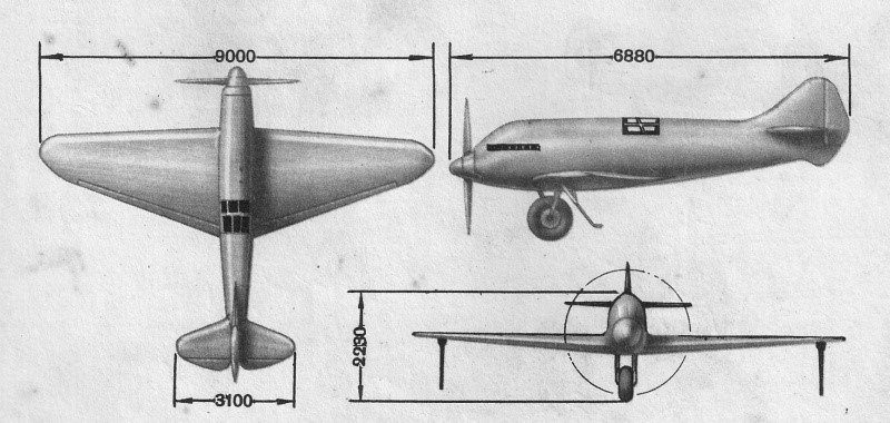 Structurally, it was conceived as a low-wing single-seater monoplane, with a wing area of 14.3 sq.m. The tail unit was of the monoplane type. One of the most unusual features of the new aircraft was the presence of a single 800 x 200 mm wheel on the front centre portion of the fuselage with two stabilization skis on the underside of the wings. Both the wheel and the skis were fully retractable. The retraction system was manual using a rope system.