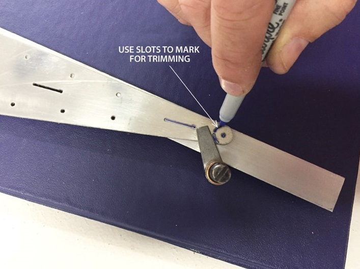 The scribe lines also include the radius of the tip bow tube. This cap is ready for trimming.