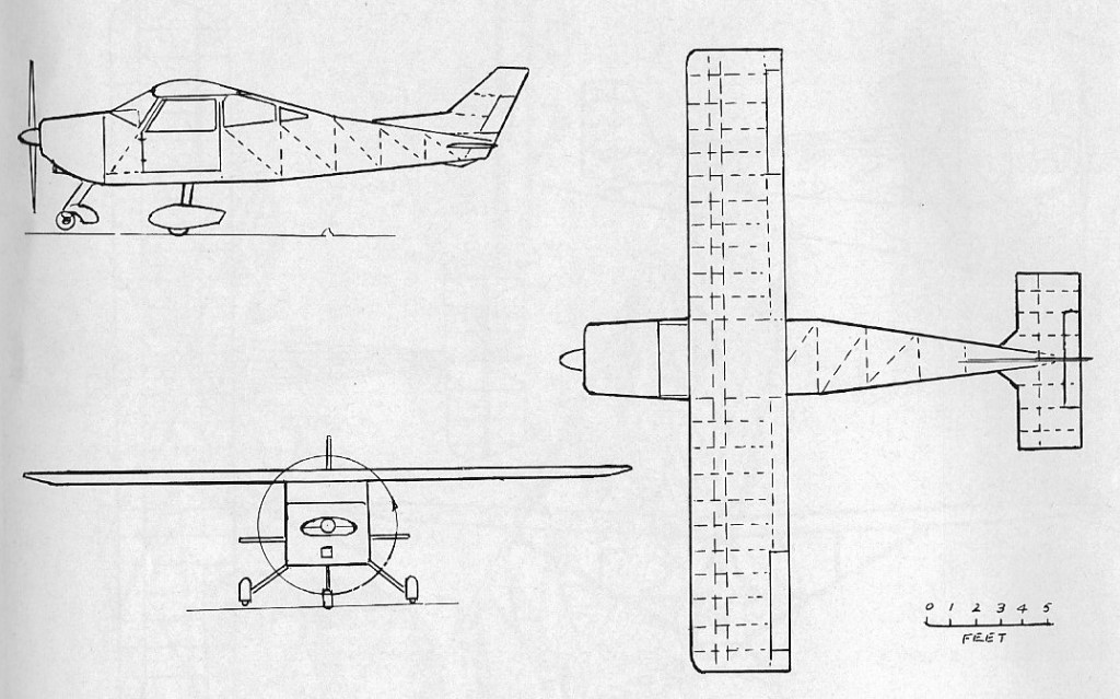 Only the wings are constructed of fiberglass. Each wing panel is built around 24 glass fibre “panel ribs”, which are slid over a 6½” diameter extruded aluminium spar to which they are secured by epoxy resin and tube clamps. Each wing then slides for 12 inches over a smaller centre section tube. The fueselage is an all metal structure of bolted together design made of 2024-T3 formed angles. The skins are “Pop” riveted or bonded to the primary structure. The all metal empennage consists of a swept fin and rudder and an all moving tailplane. The main undercarriage legs are formed from 2024-T3 aluminium plate which rotates on a pivot point in the fuselage, shock absorption being rubber in compression. The nose wheel is non-steerable. Fuel is carried in the panel ribs, the normal capacity is 24 Imperial gallons in each wing. Engines from 108 to 200 h.p. have been fitted, giving up to 190 mph If built with a fuselage extension it’s a true 4-seater.