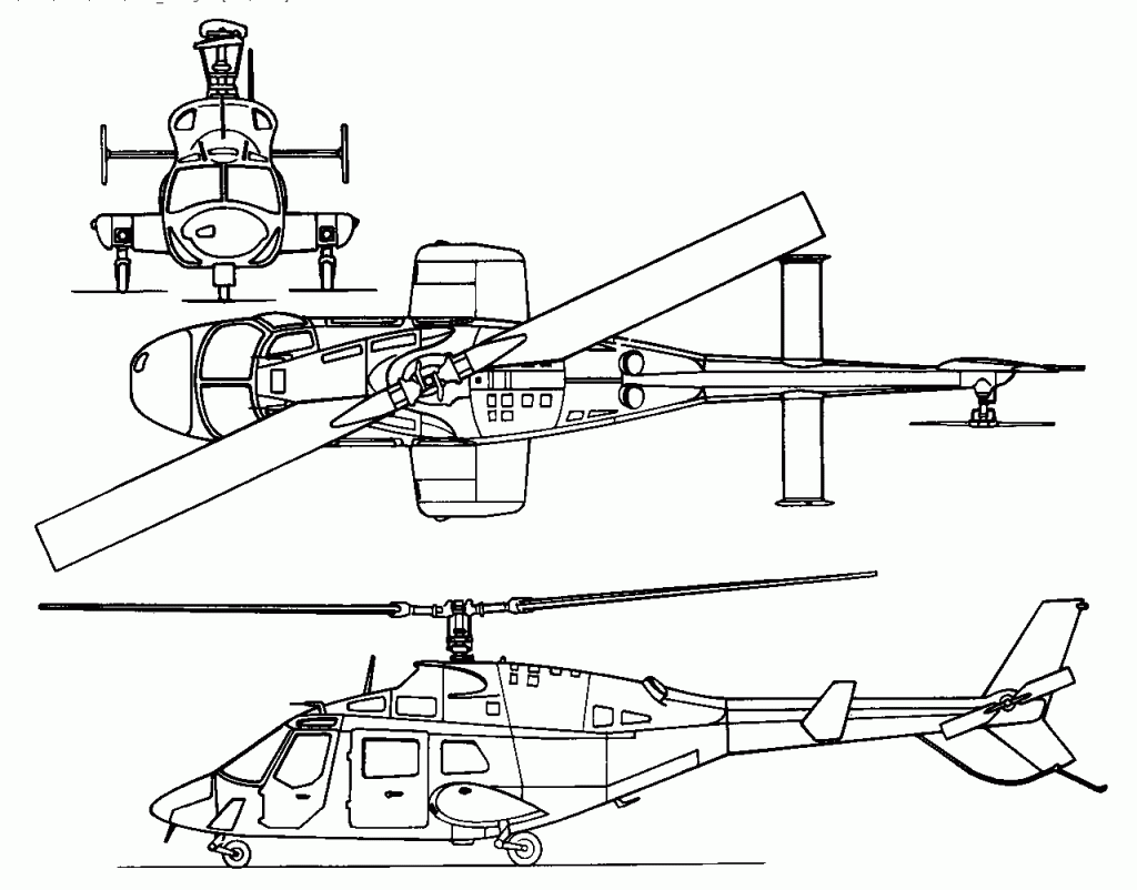 During flight tests several improvements were introduced on the prototypes, the most obvious being a completely new tail configuration. With the fourth prototype (c/n 47004, N680L) a new tail layout was adopted: the T tail was replaced by tailplanes and end-plate fins fixed forward of the rear fuselage. The main rotor diameter has been increased by 12 in (30,5 cm) and a slightly more powerful version of the Lycoming turboshaft engine has been adopted, to off-set some weight growth attributable to the new tailplane and larger rotor.