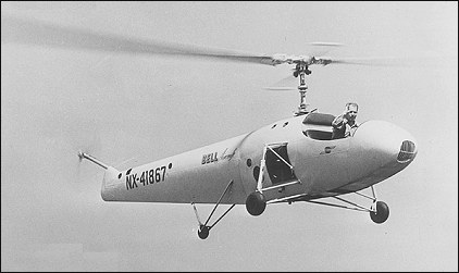 The construction of a third aircraft introduced several improvements including a four-wheel undercarriage, an advanced instrument panel and a tubular tailboom, but it retained the open cockpit of No.1. This helicopter (c/n 3, registered NX41869) flew for the first time on 25 April, 1945, and performed well, so well that it proved to be the best of the trio to demonstrate, but the open cockpit was a real handicap. To overcome this Young had the idea of covering the cockpit with a Plexiglass bubble thus providing both comfort and outstanding visibility for pilot and passenger. The shape of this aircraft was now very near to that of the Model 47.