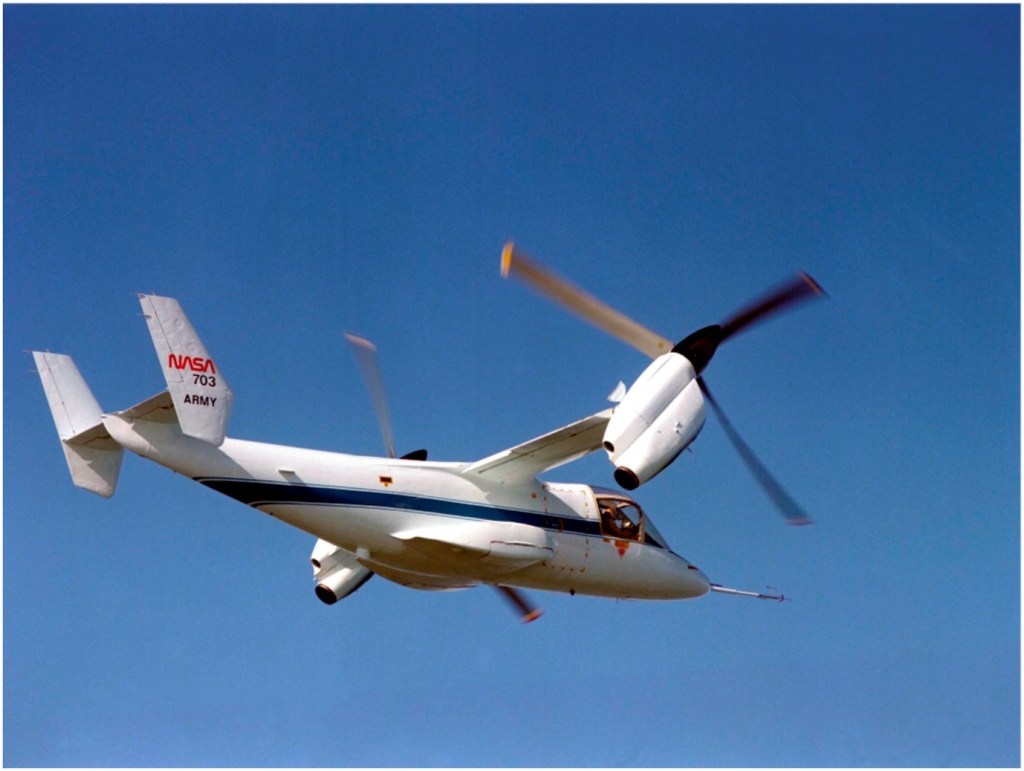 An Avco Lycoming LTC1K-4K engine, a modified version of the standard T53-L-13B engine, is mounted at each wing tip. They are rated at 1250shp for continuous operation, 1401shp for 30 minutes, 1550shp for 10 minutes for take-off, and 1802shp for two minutes for emergency power. Power is transmitted from the engines to the rotors using a coupling gearbox and transmission, which reduce the engine speed of approximately 20000 revolutions per minute down to a rotor speed of about 565 revolutions per minute in hover. The three-bladed, semi-rigid rotors measure 7.6m in diameter and have a 36cm chord. They were made of stainless steel and have a large amount of twist. (In July 1979, Bell received a contract from Ames for preliminary design of a composite rotor blade that would offer improved performance and increased life expectancy, compared to the existing metal blades. A set eventually was tested, but did not work well.) There are no flapping hinges, but the rotors can flap forward or aft as much as 6 degrees. To assure power to both rotors in the event of an engine failure, a shaft that runs through the wing interconnects the two transmissions. As a result of the interconnect, both rotors turn when the first engine starts. In the event of a double engine failure, both rotors will autorotate at the same speed. The nacelle tilt can be varied from horizontal to 5 degrees aft of vertical. Interconnected double ballscrew actuators operate the tilt mechanism in each nacelle. This assures that both nacelles always will be at the same position. The interconnected drive shafts and redundant tilting mechanisms permit single engine operation and fail-operate tilt capability.