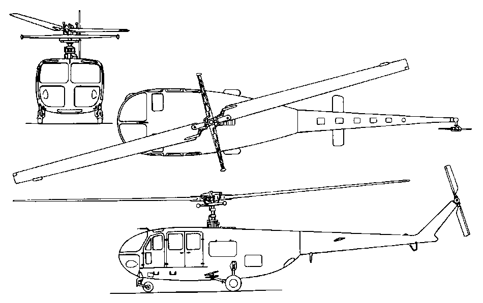 In 1946, Bell developed a new general utility helicopter of larger dimensions than the Model 47, as the Model 42, and a military version, the Model 48. The general configuration was a two-blade rotor with stabilising bar, three-wheel non-retractable undercarriage and five-seat cabin with car-like windscreen and doors. The engine was a 540hp Pratt & Whitney R-1340-AN-1 Wasp radial mounted horizontally in the rear fuselage with radiator air intake on top.