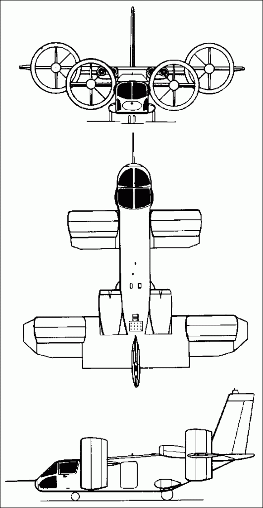 The Navy studies showed that a duel tandem ducted fan configuration permitted a shorter wing span for a given weight, allowing a stubbier design that could fit on existing carrier elevators and would eliminate the need for complex wing folding mechanisms. The duct around each of the four props also would improve propeller efficiency and provide a safety benefit to personnel working on a ship’s flight deck.