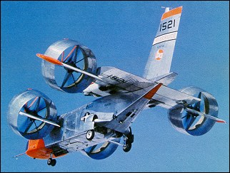 Thrust control could be obtained by varying the blade angle. Four elevens, one placed at the rear of each ducted fan assembly, were the only control surfaces. Placing the elevons in the prop slipstream made them very effective, even at low airspeeds. Despite the significant looking vertical stabilizer, there was no rudder. Movement of the elevons and changes to the prop pitch achieved all flight control.