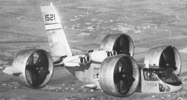 The rectangular fuselage accommodated at its rear a wide-chord wing fitted on its leading edges with two groups of two 1250-shp (932-kW) General Electric YT58-GE-8B/D turboshafts to drive four propellers (or fans) located inside annular ducts. These last were located at the tips of the wings and the short span foreplane and could be turned between the vertical (for vertical take-off and landing) and the horizontal (for forward flight). Change in the propeller pitch produced the thrust modulation for control, and was supplemented by movement of aileron in the slipstream of each duct. The “B” and “D” designations on the engines referred to two engine configurations that differed only by their fuel controllers. They powered a common drive shaft that turned all four props. These engines had both controllers and switched between them automatically based on whether the X-22 was operating in hover mode or cruise mode. 465 gallons of useable fuel was carried in fuselage tanks.