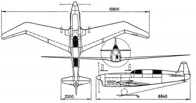 An 11 m² wingspan “butterfly” wing was attached to the fuselage, with a profile of variable thickness throughout the wingspan, 7.7% at the root and 5% at the ends, which was attached to the fuselage in low implantation. Long flaps were located on the trailing edge to improve takeoff and landing characteristics. The thin double-section ailerons were located along the entire span of the positive-taper section of the wing.