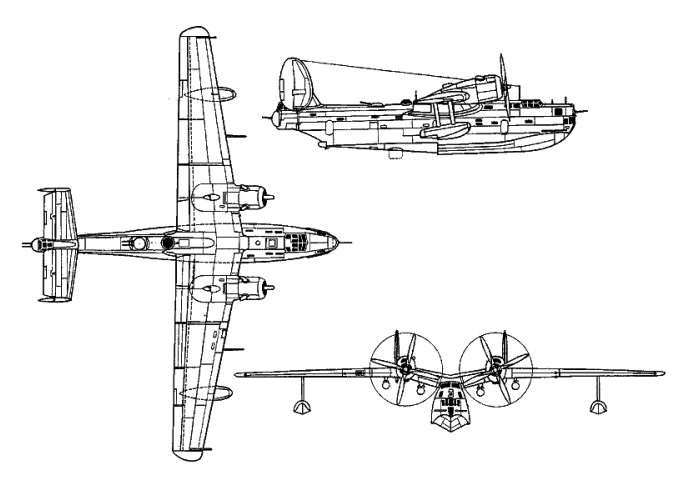 Development of a large maritime reconnaissance and bombing flying-boat was initiated by the Beriev design bureau in 1943, and the Beriev LL-143 prototype flew for the first time on 6 September 1945. An all-metal high-wing monoplane, it was powered by two 1492kW Shvetsov ASh-72 radial engines. Armament comprised twin NS-23 23mm cannon in a tail turret (behind the twin fins and rudders) and similar provision in a remotely controlled dorsal barbette. A single NS-23 cannon was installed in the bow turret.