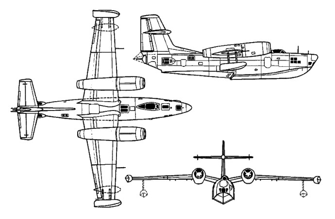 The first jet-propelled flying boat built in the USSR. The R-1 was first flown on 30 May 1952 by I M Sukhomlin. Only one prototype built.