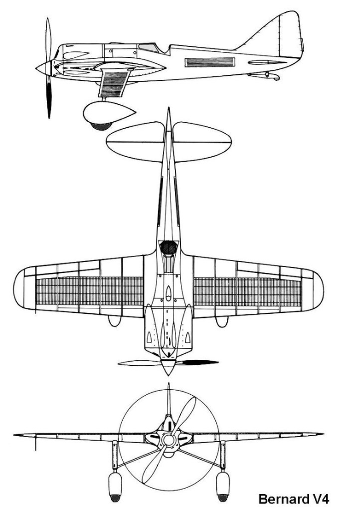 In 1933 the prototype H.S.120 seaplane racer (on pontoons) was converted into a racing landplane as the Bernard V.4 no.1 with a 1,125 hp (839 kW) Hispano-Suiza 18Sb engine and shorter span wings.