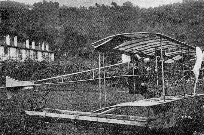 This machine was owned by M. Betteo and built by A. Caravaggio, who also provided the four-cylinder air-cooled “semi-radial” engine, which was placed immediately in front of the pilot and drove the propeller via a long shaft. The tail surfaces were fixed, but the incidence of the wings could be changed by 35 degrees by a patented mechanism, thereby achieving pitch control.