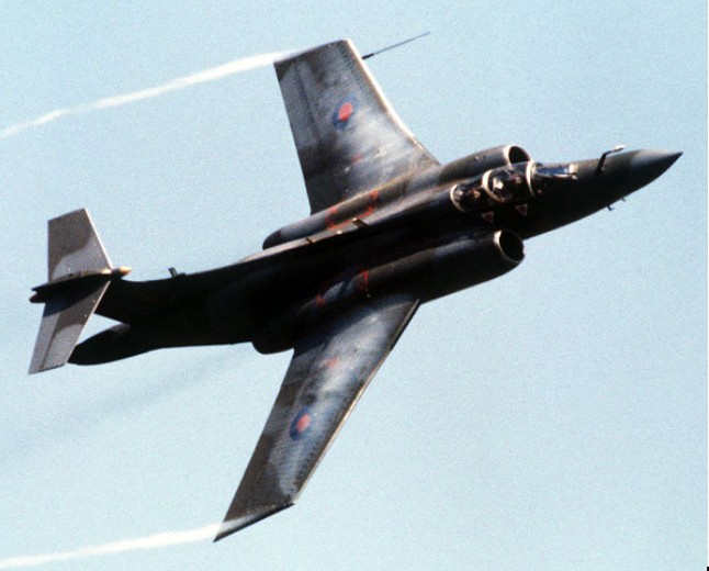 The Buccaneer features mid-set wings with compound sweepback, swept tail services, with tailplane mounted at the top of the fin. The ailerons droop to supplement flaps during landing. Air is blown over wings, ailerons, flaps and tailplane to reduce take-off and landing speeds. The tail-cone splits along the centreline to act as an airbrake. The outer wings fold upwards for stowage on board ships.