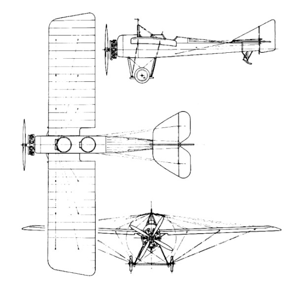 The White Falcon was built by Blackburn during 1915 for the personal use of their test pilot, W. Rowland Dring. It was a mid-wing, wire braced monoplane with open cockpits for pilot and passenger, powered by an uncowled 100 hp (75 kW) Anzani radial engine driving a four-blade 9 ft (2.74 m) diameter propeller. The wings were of parallel chord and generally like those of the Improved Type I, though 1 ft (31 cm) greater in span, similarly wire braced to an inverted ‘V’ kingpost and to the undercarriage. The wing warping wires also ran via the kingpost. The White Falcon initially used a standard B.E.2c undercarriage (Blackburn’s were one company manufacturing these aircraft during the war) but this was replaced later with a simpler structure without skids.