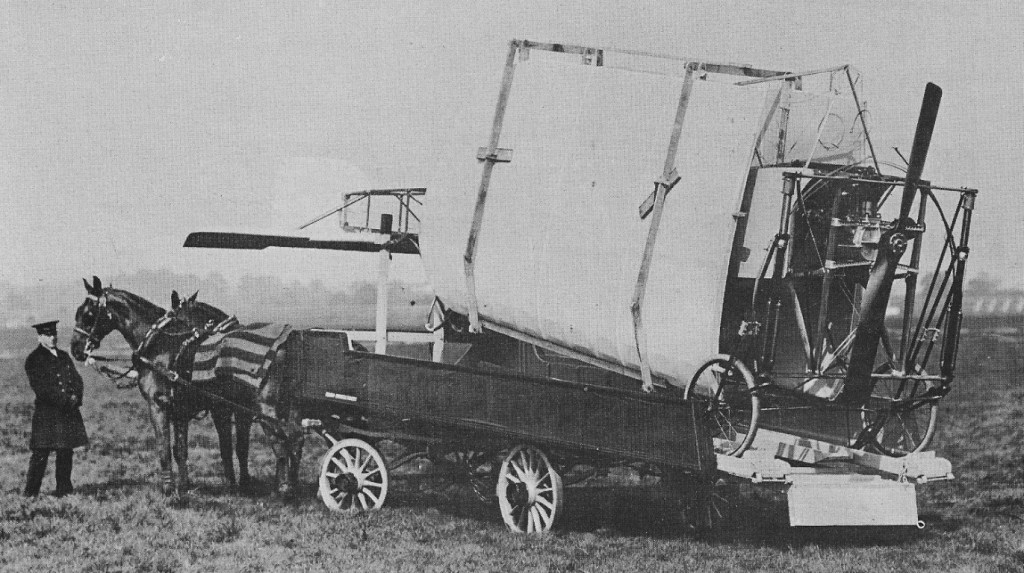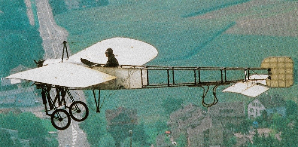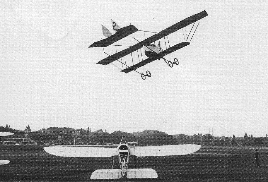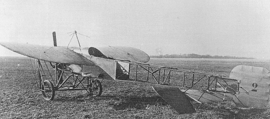 Shown fitted to a Blériot XI, the 1911 Ponti parachute triangular construction would release a parachute in an emergency. When flying normally, Ponti’s invention would act somewhat like a second wing. When so needed, the parachute would be opened by a spring which given the flow of the air during flight would then inflate the parachute. A test was planned at Taliedo with pilot Deroy, but that did not take place.