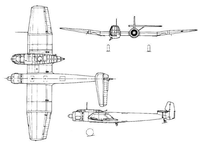 Resulting from a 1937 requirement for a short-range reconnaissance plane with a single engine and accommodation for a crew of three, Richard Vogt, the technical director of Blohm und Voss’s aircraft subsidiary, Ham¬burger Flugzeugbau, proposed that an official RLM requirement could best be met by an asymmetric design. The result was the company financed Ha 141 0, flown in Feb¬ruary 1938 with Major General Ernest Udet at the controls. An unorthodox machine with an extensively glazed crew nacelle offset to starboard of the centerline and the 865-hp (645-kW) BMW 132N radial engine to port at the front of the boom supporting the tail unit. A perspex-glazed crew gondola on the starboard side housed the pilot, observer and rear gunner, while the fuselage on the port side led smoothly from the engine to a tail unit.