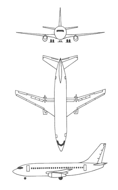 As originally conceived, the Boeing 737 series 100 could accommodate sixty to eighty-five passengers but after talks with Lufthansa this was increased to around 100 seats. The newly designed wing was required to give good lift and have excellent low speed characteristics for short-field operations, around 870nm. The engines selected were two Pratt & Whitney JT8D-1 turbofans, each of 14,000 pounds thrust, but following negotiations with Lufthansa the more powerful JT8D-7 turbofan was chosen for it could maintain the same thrust at higher ambient temperatures. The aircraft has almost the same fuselage cross-section as the longer 707 and 727, designed so that maximum use could be made of 727 tooling and components to keep initial costs low. The aircraft is powered by the JT8D turbofan engine developed for the 727, and has the 727’s high-lift system. The 737 utilised the same nose and fuselage section as the 727. Wing sweepback on the 737 is 25 degrees. The prototype 737-100 first flew on 9 April 1967 and was so successful that by 15 December 1967 FAA certification was complete and Lufthansa took delivery of their first machine on 28 December 1967. They made their first scheduled 737 passenger flight on 10 February 1968. Only 30 of the -100 series were built.