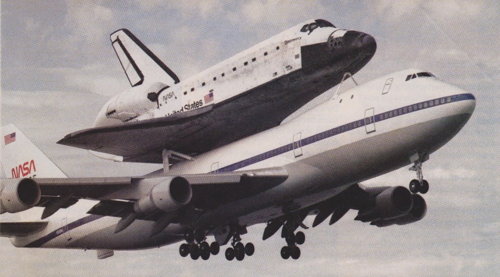 The Boeing 747 123 Shuttle Carrier Aircraft (SCA) (NASA 905), was flown for the first time on 16 December 1976. The Shuttle Carrier Aircraft (SCA), for which Boeing became the contractor to convert an ex American Airlines Boeing 747 123 to carry an SSO mounted above its fuselage, has meant structural reinforcement to withstand the weight of the 150,000 1b (68039 kg) SSO above the fuselage, supports and clamps to hold it in position, and to provide increased stability when paired with the Shuttle the 747 had endplate fins added to its tailplane.